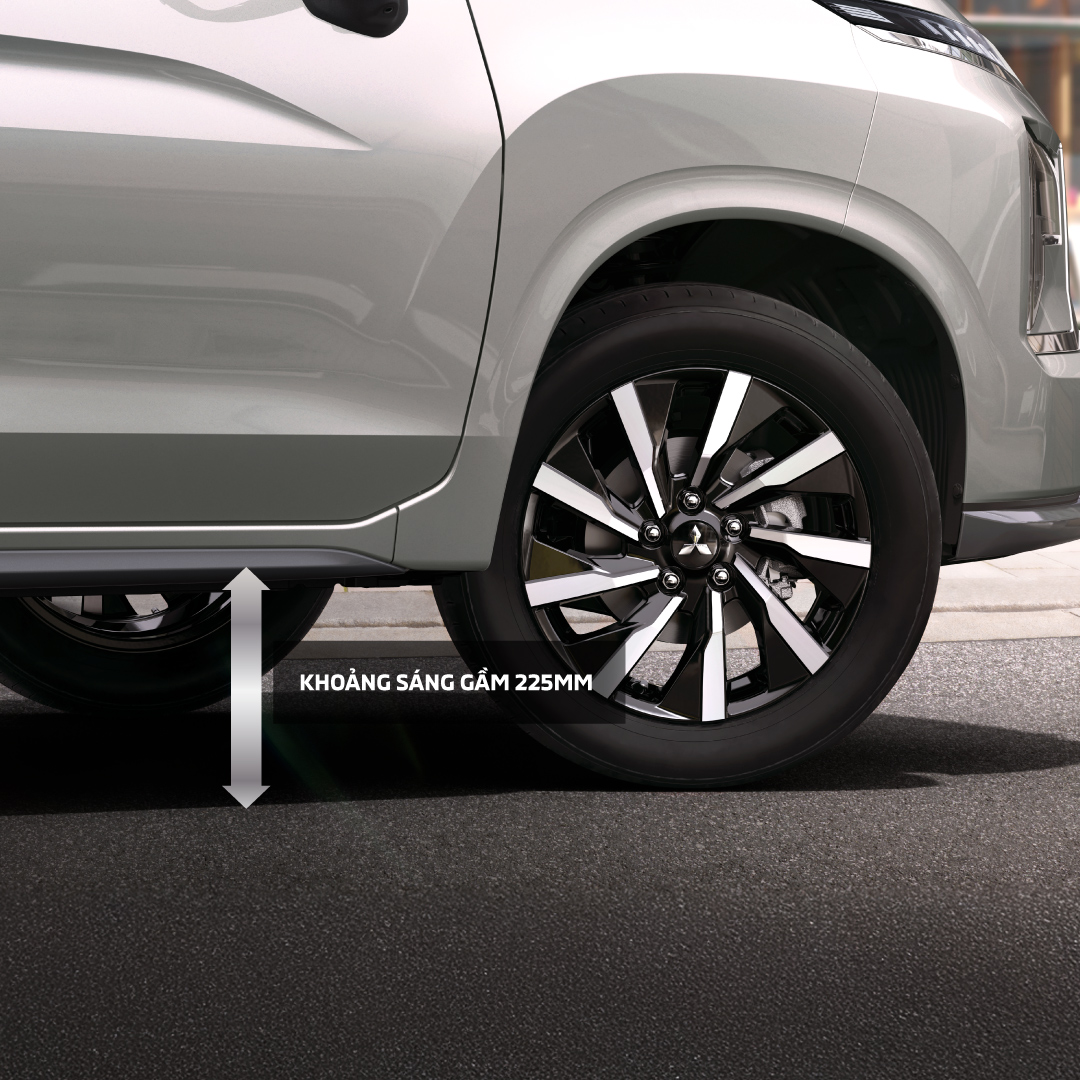 Chất Crossover của Mitsubishi Xpander đến từ những đường nét thiết kế khỏe khoắn kết hợp cụm đèn chiếu sáng phía trước LED thấu kính T-Shape và mâm xe 17-inch ấn tượng. Khung gầm cứng vững, chiều dài tổng thể được tăng thêm 120mm và khoảng sáng gầm xe nâng cao đến 225 mm tốt nhất phân khúc đem đến khả năng vận hành linh hoạt trên nhiều điều kiện địa hình.
