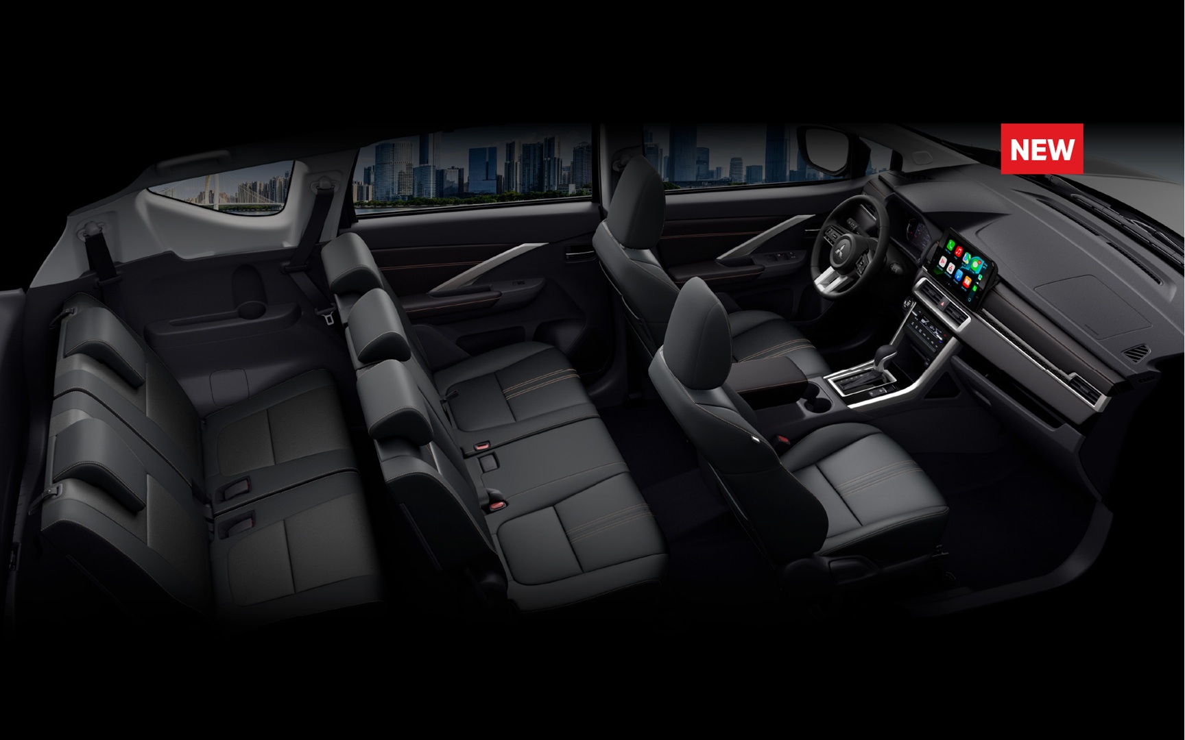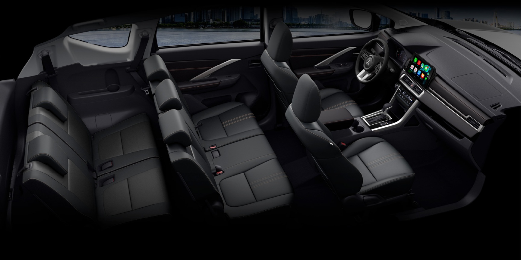 Sức hút của Xpander còn đến từ nội thất hai tông màu hoàn toàn mới, mặt táp-lô với thiết kế theo phương ngang “Horizontal Axis” tạo không gian nội thất rộng rãi, sang trọng cùng vật liệu mềm, cao cấp trên táp lô và trang trí cửa xe mang lại cảm nhận tinh tế và đẳng cấp. Xpander rộng rãi ở cả 3 hàng ghế với khả năng tối ưu hóa không gian với 7 chế độ xếp ghế linh hoạt (gập mở hàng ghế thứ 2 và thứ 3 theo nhu cầu sử dụng).